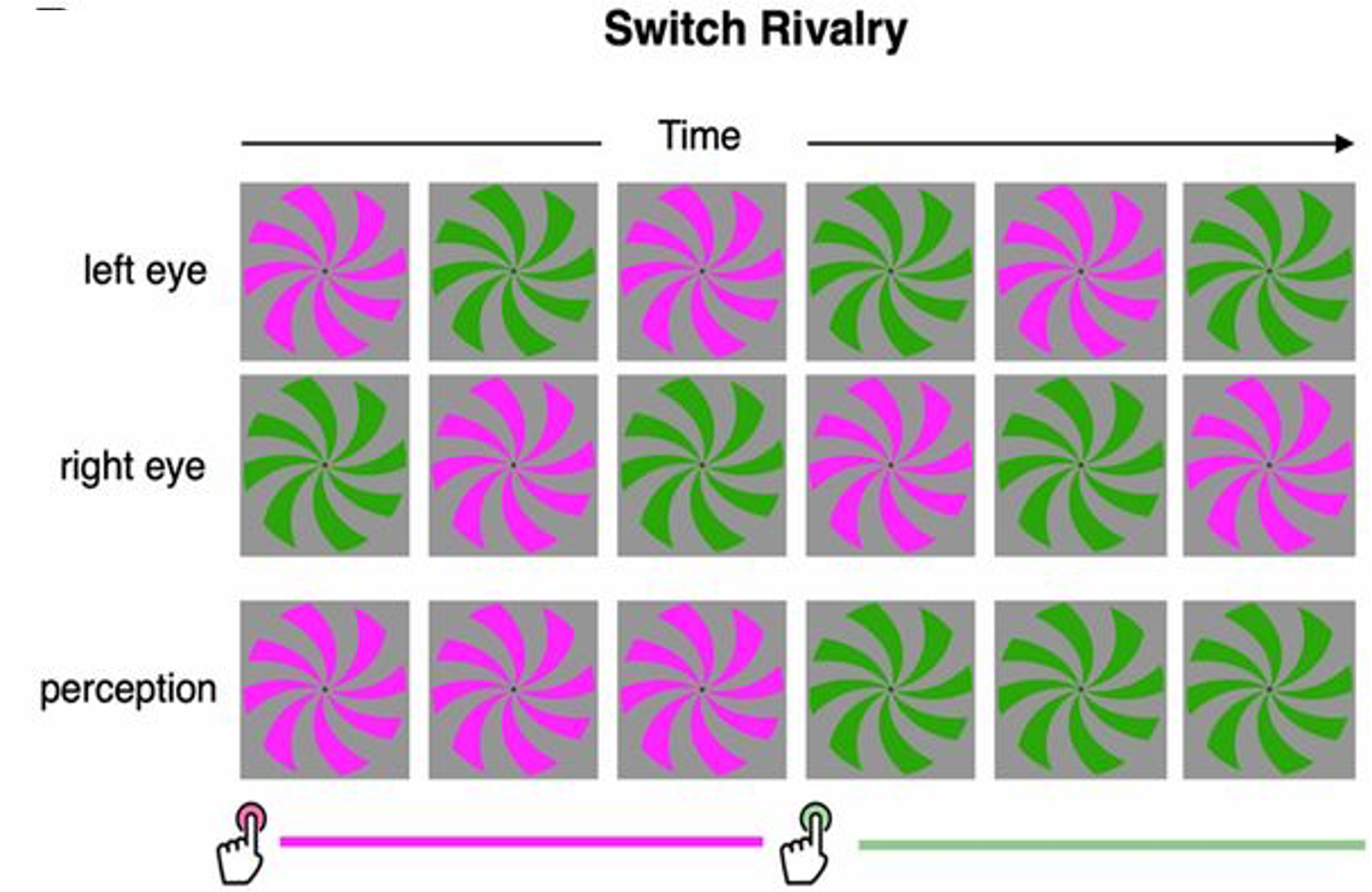 Interocular switch rivalry. Two different chromatic stimuli were continuously presented to each eye to induce perceptual rivalry so that only one of the two colors was seen at a time. The chromatic stimuli were swapped between the two eyes at a frequency of 4.25 Hz so that identical stimuli were presented to each eye over a given time period. Observers indicated their moment-to-moment perceived colors by continuous button presses.